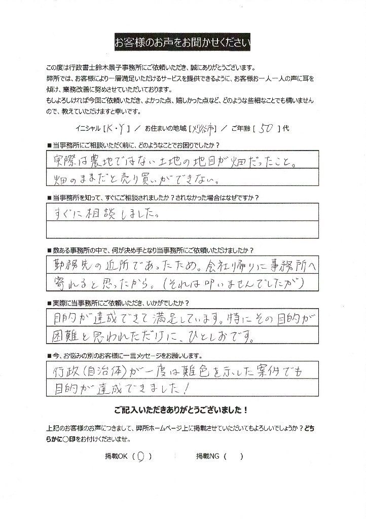 また、土地があるのは刈谷市ではなく西尾市であり、ご本人が現地確認や役所との交渉を進めるには相当な労力と時間がかかるため、「専門家である行政書士に任せた方が確実で早い」とご判断されたことも、ご依頼の決め手となりました。